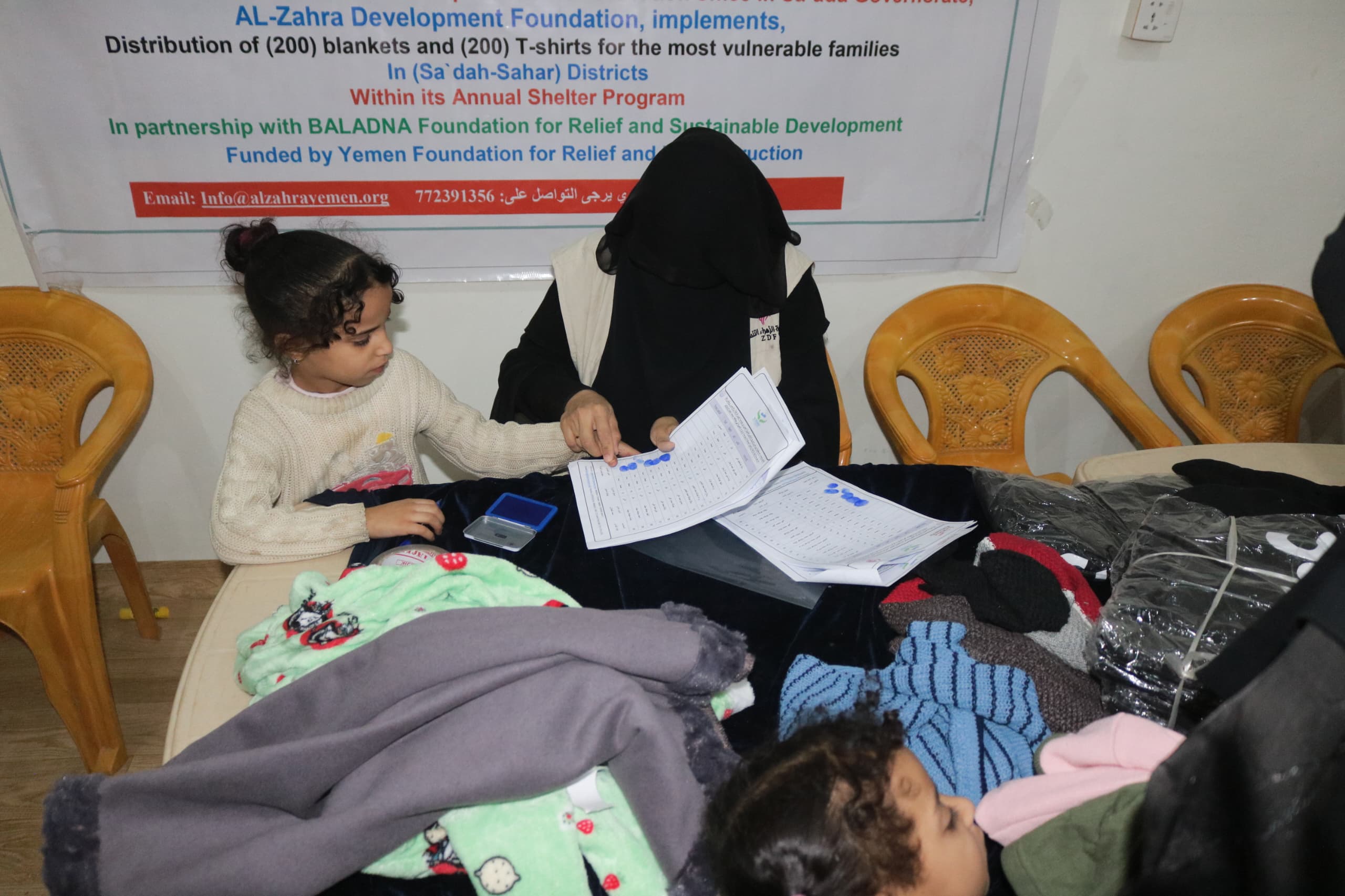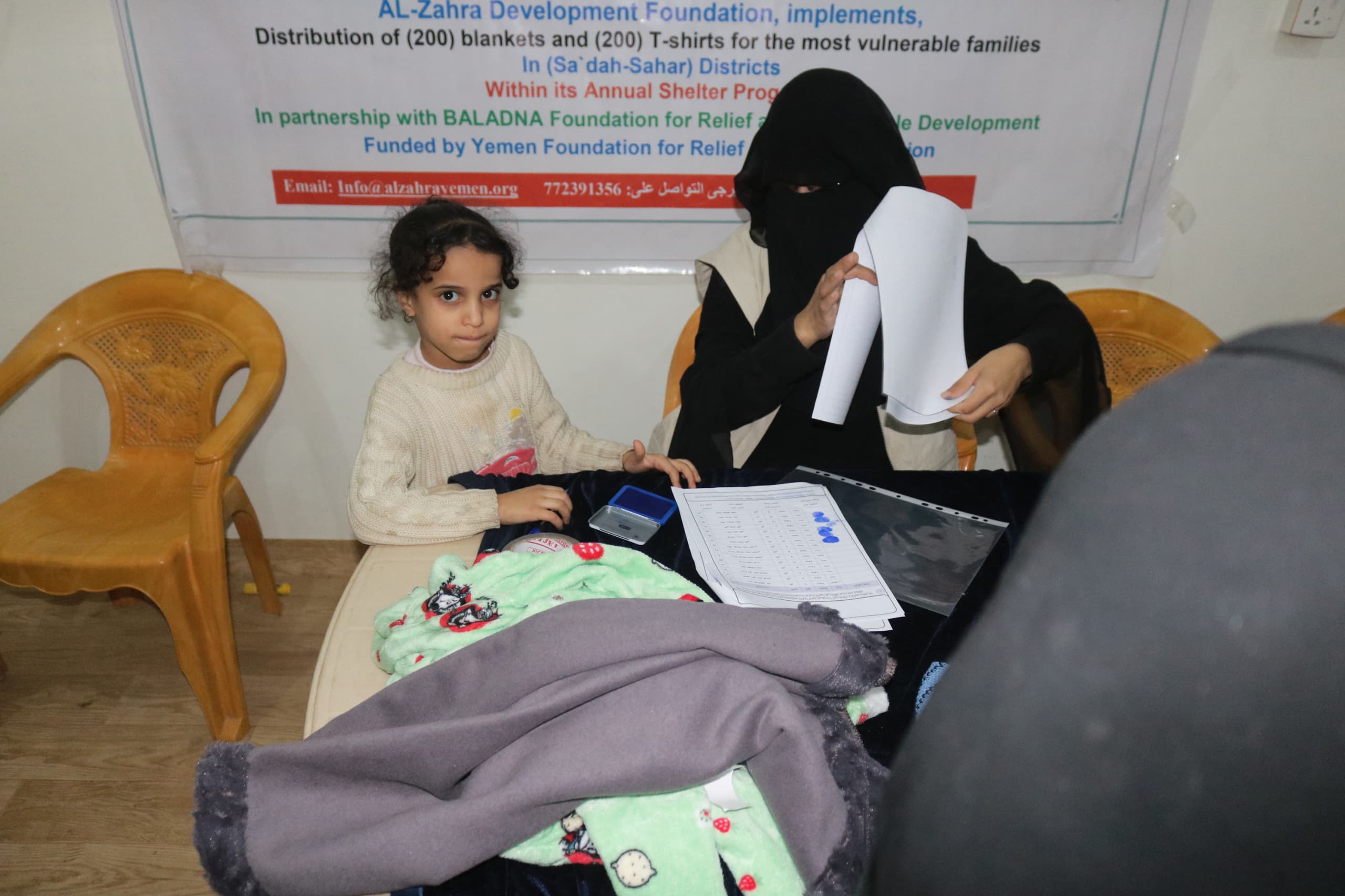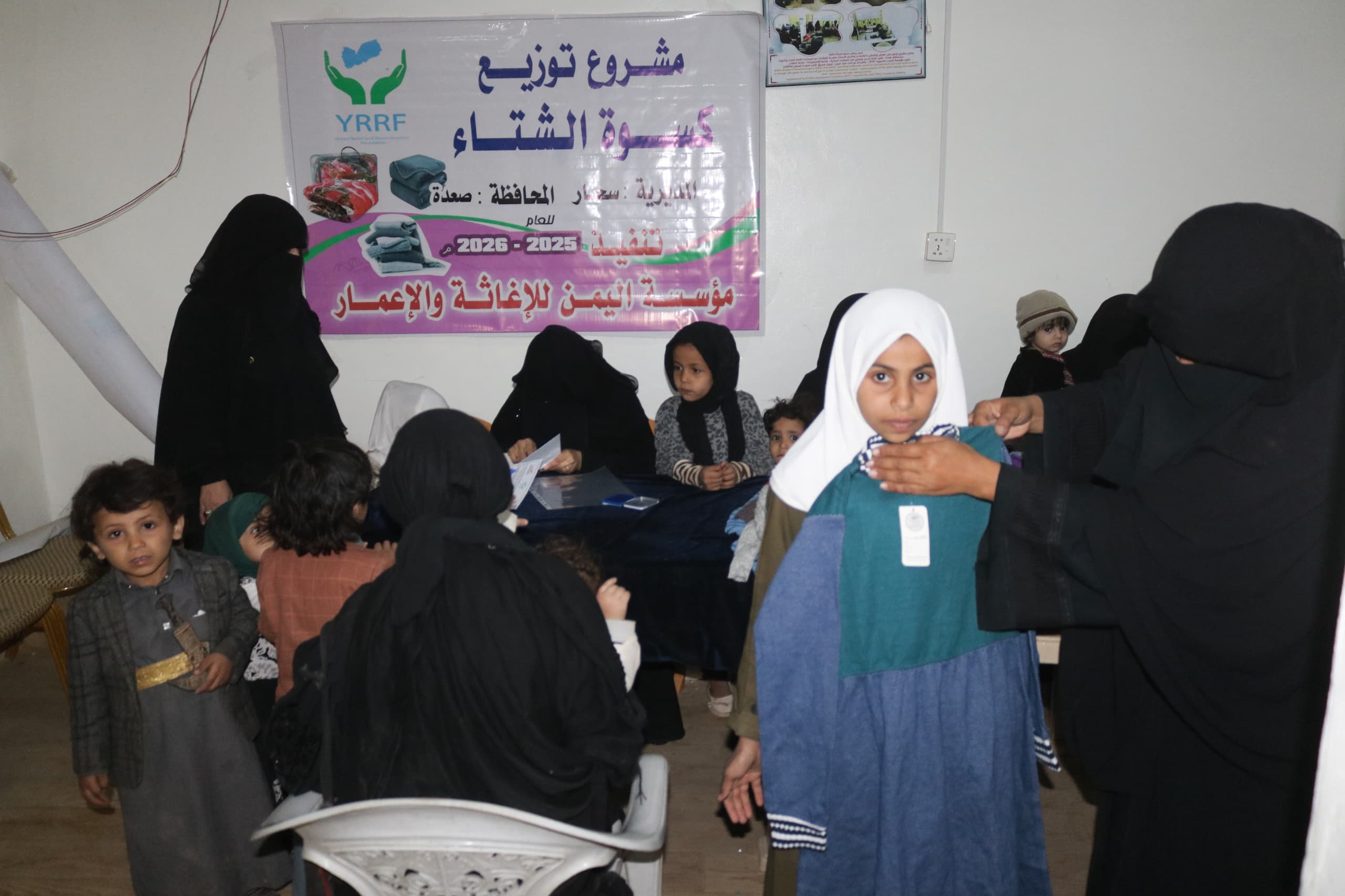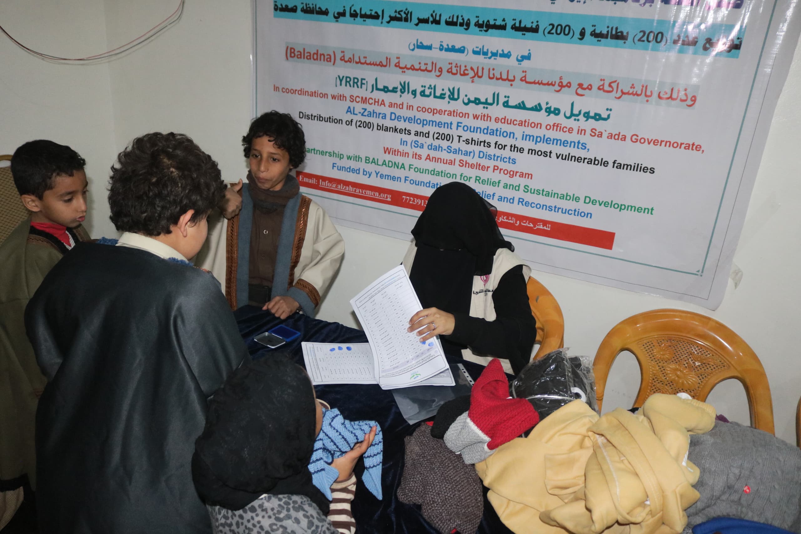 دشنت مؤسسة الزهراء التنموية مشروع توزيع الكسوة الشتوية في مديريتي (سحار – حيدان) بمحافظة صعدة والذي شمل توزيع (200) بطانية و(200) فنيله شتوية استهدفت الأطفال من الأسر الأشد احتياجاً وذلك بتمويل من مؤسسة اليمن للإغاثة والإعمار و بالشراكــة مع مؤسـســــة بــلــدنا لـلإغاثـة والــتــنــمـيـــة الـمستــدامـة